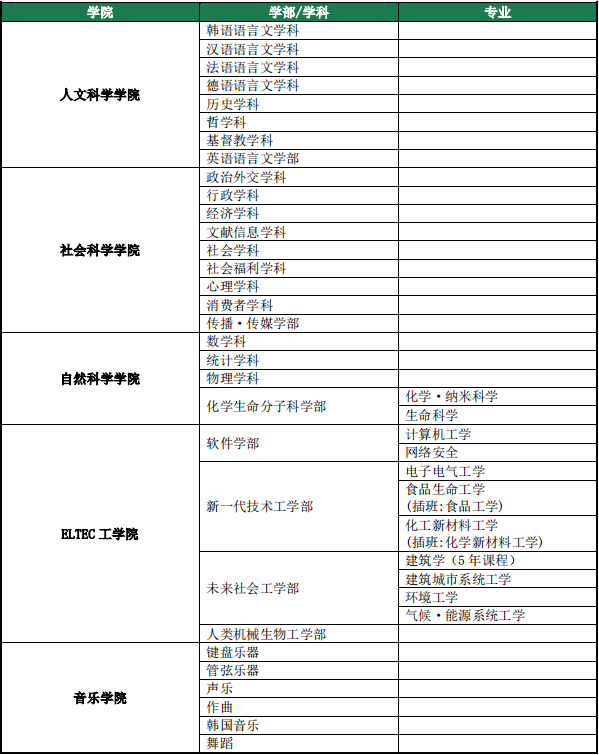 梨花女大是一所分科全面的优秀大学。大学部分为人文科学,社会科学,自然科学,工科,音乐,造型艺术,体育科学,司法,法学,经营,医科,看护科学,药学,生活环境,国际学部共15大学院,70多个专业。【师范类】在梨大有一个规模颇大的师范学院,学科齐全。设有教育学系、幼儿教育系、初等教育系、教育工程系、特殊教育系、英语教育系、韩国语教育系、科学教育系、数学教育系、科学生活学系。【工商管理类】在梨大设有工商管理学院,主要开设工商管理专业和国际事务学系专业。梨大培养了众多女性政要和高层管理者;例如韩国第一位女性国务总理韩明淑、现代集团会长玄贞恩。【艺术设计类】在梨大有专门的造型艺术学院。下设有造型艺术学部、设计学部、纺织服装学部。开设的专业细分化,比如东洋画专业、雕塑专业、陶瓷专业、服装设计专业、空间设计专业等。如果具备美术功底和创意,可以考虑建筑学、工业设计、数字媒体设计等专业。